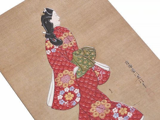 緋色の衣裳をまとった美人がふと見返る一瞬を描いた作品で、世界的にも広く知られている名作です。艶やかな着物にあしらわれた繊細な模様や、しなやかな髪の毛の動きに合わせて凹凸加工を施しました。背景をフラットにしているため、凛とした美人の佇まいが際立ち、まるで浮かび上がるように感じられるポストカードです。時代を超えて受け継がれる美の象徴を、長く手元に残してお楽しみいただけます。