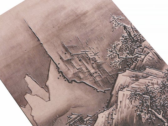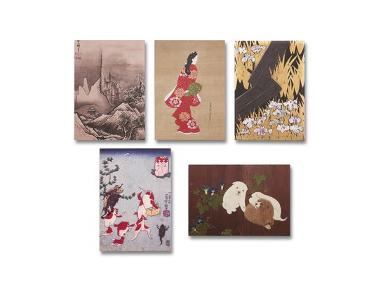 山水画の傑作として名高い作品の世界観をそのままに、筆致のリズムや墨の濃淡を、凹凸の強弱によって立体的に表現しました。力強く引かれた岩肌や木の幹の線には厚みを持たせ、かすれた筆致で描かれた遠景や霧のような部分には控えめな加工を施すことで、自然な遠近感と奥行きが感じられるようにアレンジしています。水墨の余白がもつ静寂と、山水が描き出す雄大な世界を心ゆくまで堪能できるポストカードです。