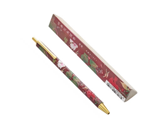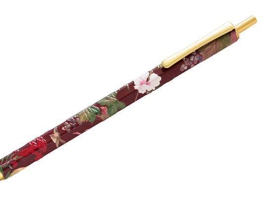 鮮やかな鶏頭や白い花、緑の葉が誇らしく咲き誇る一場面を、360度どこから見ても美しく映るように再構成しました。葉の葉脈や絡み合う細い蔦に至るまで、モチーフに合わせた質感の細かい凹凸を施し、立体的な表現を追求しています。背景には草花の色彩を引き立てる深みのある濃赤を採用し、漆を思わせるような艶やかさを演出しています。華やかさと気品を兼ね備え、手元に確かな存在感を添えてくれるボールペンです。