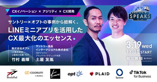 株式会社ニューピークス主催で2025年3月19日(水)に開催される「SPEAKS 進化する顧客体験サミット」に、オプトのCX開発領域 上級執行役員:SVP 竹村 義輝が、サントリー食品インターナショナル株式会社 SBFジャパン ブランドマーケティング本部 土屋 友胤氏とともに登壇いたします。新ブランドが市場参入で直面した課題に対して、LINEミニアプリを開発し、アジリティ高くユーザーインサイトを探求した事例ついてお話しています。ぜひご視聴ください。