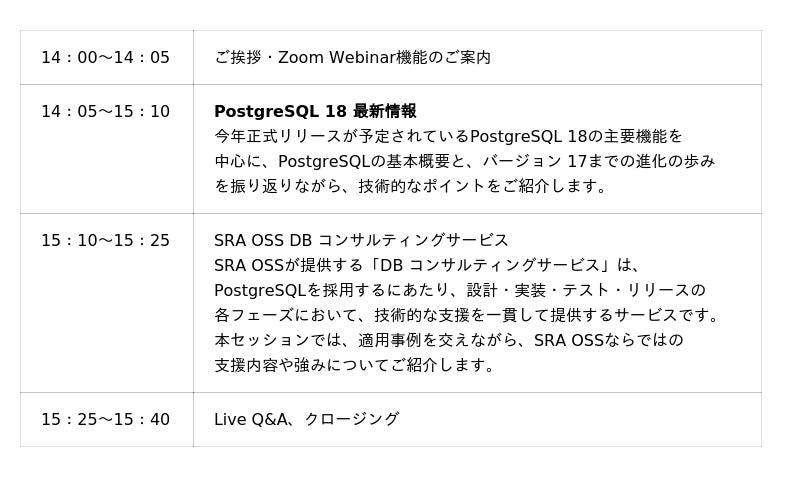 株式会社SRA OSS(東京都豊島区、代表取締役社長: 稲葉 香理、以下 SRA OSS) は、2025年秋にリリース予定のPostgreSQL 18について、検証レポートを公開しました。これに合わせ、新機能を一挙解説するオンラインセミナーを9月12日(金)に開催します。