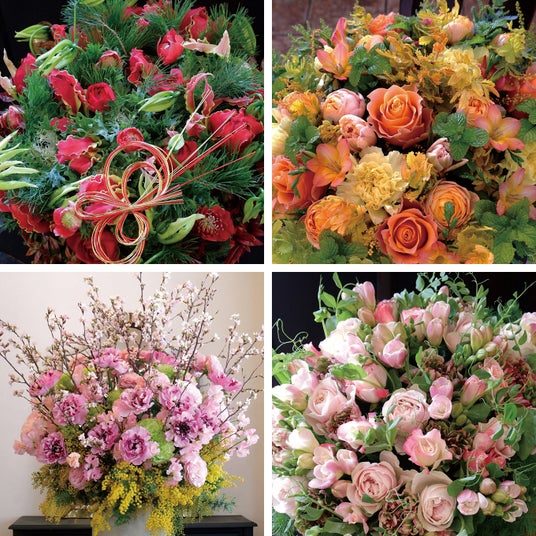 (左上)1月:和の正月飾りをモダンに (右上)2月:黄花とハーブでいきいきと彩る (左下)3月:門出を祝う大胆な桜アレンジ (右下)4月:レトロ可愛い春色のピンク