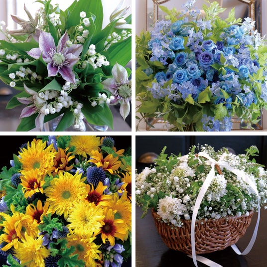 (左上)5月:可憐で儚げな引き算の美 (右上)6月:感動と驚きの美しきブルー (左下)7月:多様な花形で躍動する夏の花 (右下)8月:色合わせで可憐に、涼し気に