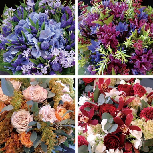 (左上)9月:表情豊かな秋の青花 (右上) 10月:宝石のような輝きを主役に (左下) 11月:ユニークな花形で印象的に (右下) 12月:雪降る聖夜の色を集めて
