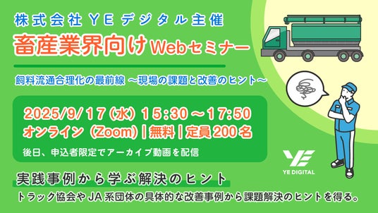 株式会社YE DIGITAL(本社:北九州市小倉北区、代表取締役社長:玉井裕治、以下、YEデジタル)は、この度、飼料メーカー、飼料配送業者、畜産農家の皆様を対象にしたセミナー『飼料流通合理化の最前線 ~現場の課題と改善のヒント~』を2025年9月17日(水)に開催いたします。