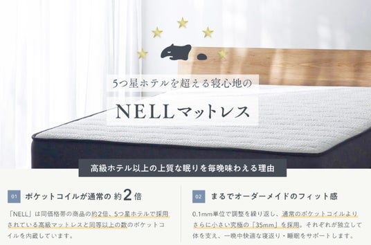 「NELL マットレス」は5つ星ホテルで使用されているマットレスの2倍以上、業界最高水準の1734個ものポケットコイルを使用した高品質な商品です。
