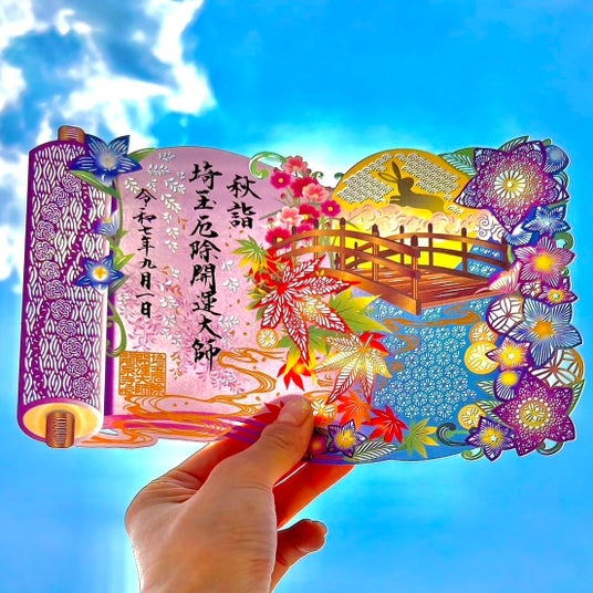 切り絵御朱印発祥の寺「埼玉厄除け開運大師・龍泉寺」にて2種類の秋限定重ね切り絵御朱印『秋の花舞う大師堂―百花繚乱ー』『秋詣 ―秋夜橋―』の授与開始