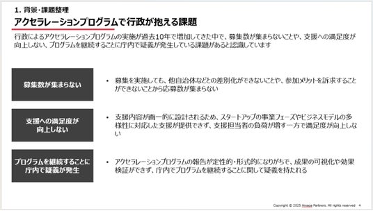 過去10年間で行政によるアクセラレーションプログラム(スタートアップの短期集中育成プログラム)の実施が増加する一方、募集数が集まらないことや、支援への満足度が向上しない、プログラムを継続することに庁内で疑義が発生している課題があると認識しています。