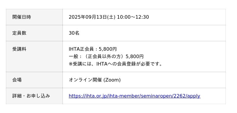 一般社団法人 国際ホリスティックセラピー協会※(事務局:東京都千代田区、代表理事長:高橋 健介、以下 IHTA)は、2025年9月13日(土)に『アーユルヴェーダ×夏から秋に向けての季節ヨガ』オンラインセミナーを開催いたします。