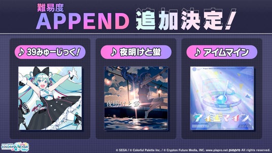 「39みゅーじっく!」(作詞・作曲:みきとP)、「夜明けと蛍」(作詞・作曲:n-buna)、「アイムマイン」(作詞・作曲:halyosy)に、難易度「APPEND」の譜面が追加されることが決定いたしました。