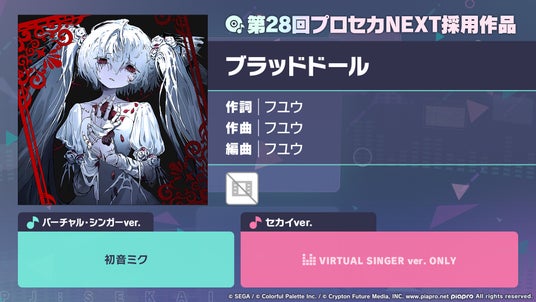 新たなリズムゲーム楽曲として、以下5曲の追加が決定いたしました。「ブラッドドール」(作詞・作曲:フユウ)は、「一緒に作ろう!第28回楽曲コンテストプロセカNEXT」の採用作品となります。