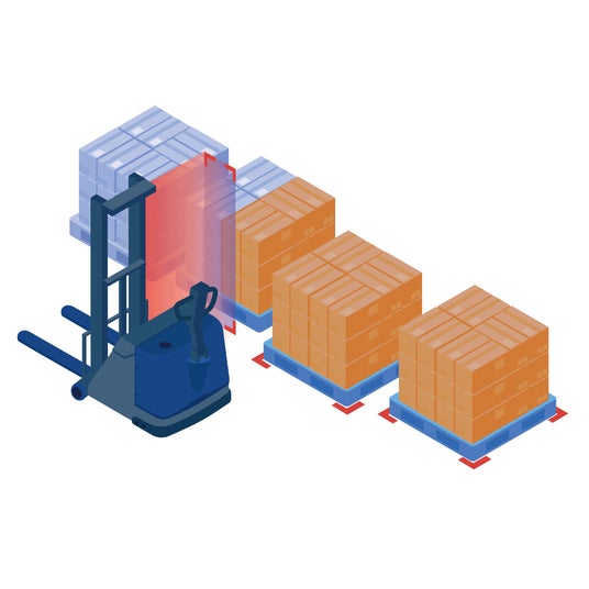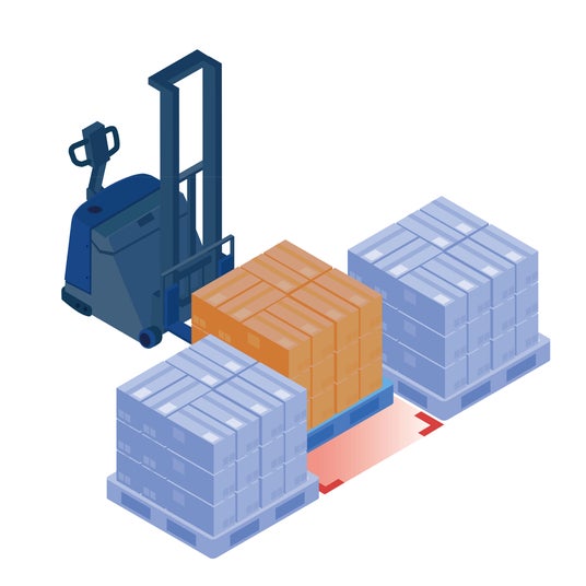 ◆不整列に置かれた複数のパレットにも対応可能!「複数パレット一括認識機能」機体右側面にパレット認識用のセンサーを搭載。並べて置かれたパレットを走行中に検知、認識します。パレットの位置と個数を把握すると同時に、フォークをパレットの穴に差し込む角度と走行経路を計算し、効率的にアプローチします。複数のパレットを一度に認識できるため次の作業への移行がスムーズで、搬送効率を高めます。