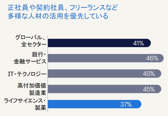 ライフサイエンス・製薬業界のリーダーの73%が今年、労働力のアジリティへの注力を強めていると回答しているものの、この数値は世界平均の87%を14ポイント下回っています。また、「正社員や派遣社員、フリーランスなど多様な人材の活用を優先している」と答えた企業はわずか37%に留まり、主要業界の中で最も低い数値となりました。このことは、固定的な役割からスキルベースの考え方へと転換する機会を示唆しています。本レポートは、仕事をモジュール式のタスクに分解する「ピクセル化」を進め、固定的な役割構造を打破し、ハイブリッド、プロジェクトベース、フリーランスなどの柔軟なモデルを統合していくことが必要と指摘しています。