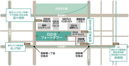 東京メトロ丸ノ内線・日比谷線・千代田線「霞ケ関」駅 C3出口より徒歩2分都営三田線「内幸町」駅 A8出口より徒歩3分、A4a出口より徒歩4分東京メトロ銀座線「虎ノ門」駅 9番出口より徒歩3分東京メトロ銀座線「新橋」駅 7番出口より徒歩7分JR「新橋」駅 日比谷口(SL広場)より徒歩8分都営浅草線「新橋」駅 A2-2出口より徒歩11分新交通ゆりかもめ「新橋」駅 東口より徒歩10分