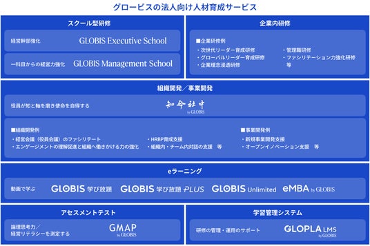 グロービスの法人部門では、経営層や次世代リーダー層を対象とした集合研修・スクール型研修、動画学習サービス「GLOBIS 学び放題」、学習管理システム「GLOPLA LMS」、アセスメントテスト「GMAP」などを提供し、企業の課題解決や、各社の成長フェーズに応じた人材育成を支援しています。