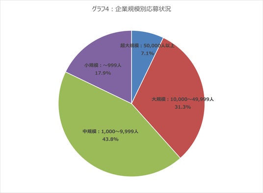 応募企業の規模別では、中規模企業が全体の43.8%と最も多く、次いで大規模企業が31.3%となり、両者を合わせると全体の約75%を占めました。小規模企業は17.9%、超大規模企業は7.1%となりました。