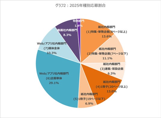 デジタル化が加速する中、Web/アプリ社内報部門の応募が前年より増加し、全体の約4割を占めました。一方で紙媒体も依然として過半数を維持しており、引き続き主要な情報発信の手段となっています。