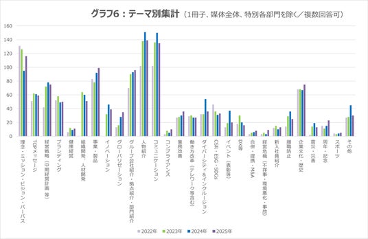 応募企画のテーマは複数選択可能な形式で集計しており、件数ベースで比較しています。2025年は人物紹介、コミュニケーション、理念に関する企画が多いので、従業員同士の理解促進や企業理念浸透を図りたい意図がうかがえます。