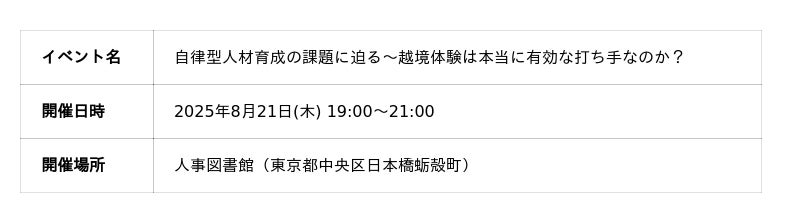「自律型人材の育成が急務だ」「主体性を持って行動できる社員を増やしたい」 多くの企業で共通の課題となっている人材育成。従来の画一的な研修だけでは限界を感じる中、新たな打ち手として「越境体験」が注目を集めています。