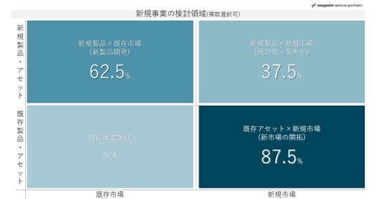 ・新規事業の検討領域は、堅実に、既存市場や既存製品・アセットと掛け合わせた領域でのチャレンジが多く見られる