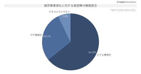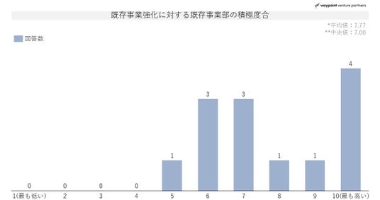 ・メリットが分かりやすい既存事業強化に対する経営陣の積極度は9割を超え、既存事業部の積極度も高い