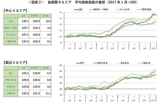 なお、東京都下、神奈川県(横浜市・川崎市/他)、千葉県他は2017年1月以降最高額を更新した。