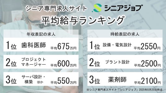 シニア専門求人サイト「シニアジョブ」平均給与ランキング もっとも高い平均年収は675万円、平均時給は2550円