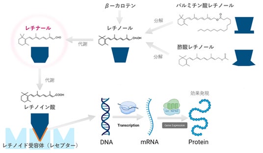 たった1回の代謝でレセプターに結合できる「レチナール」の存在は知られていましたが、その活性の安定化が非常に困難である上に刺激性があり、化粧品原料として製品化が難しいものでした。