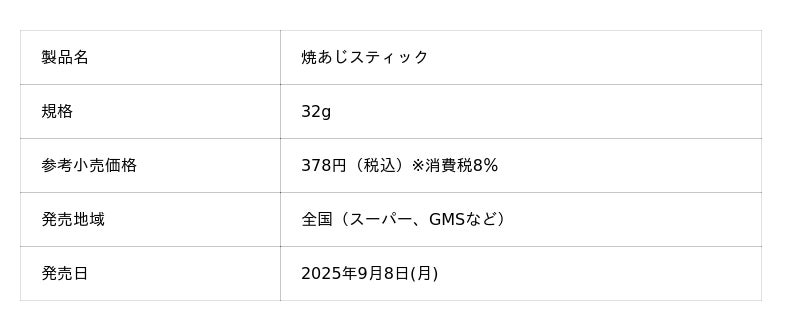 株式会社なとり(本社:東京都北区 会長兼社長:名取三郎)は、「焼あじスティック」を9月8日(月)より新たに発売いたします。