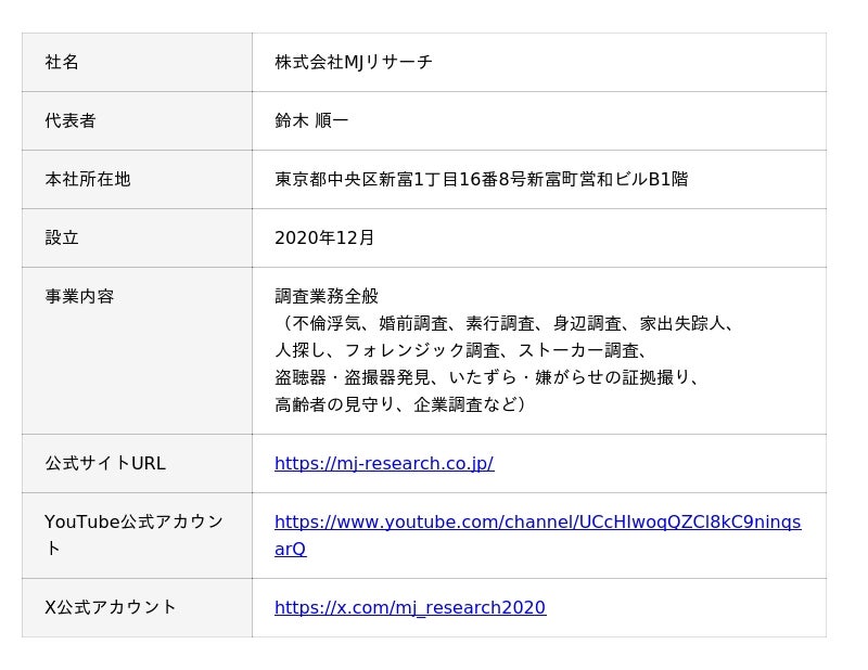 近年、マッチングアプリ等で知り合った相手による詐欺被害、 片親による子どもの連れ去りなどが社会問題化する中、これらの問題に直面した当事者や被害者からの調査の依頼や相談を受ける機会が増えています。 MJリサーチは、これらの問題に関する調査に積極的に取り組み、NHKやフランステレビなど国内外の大手メディアから取材を受けてきました。 このたび、元警視庁公安捜査官として豊富な専門知識と知見を持つ松丸俊彦氏を顧問に迎えることで、多様化・深刻化する調査依頼への対応力を高めていきます。また、依頼者様が抱える深刻な問題の根本解決に向けたサポートをさらに強化したいと考えております。松丸俊彦氏のプロフィール