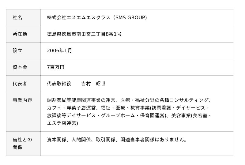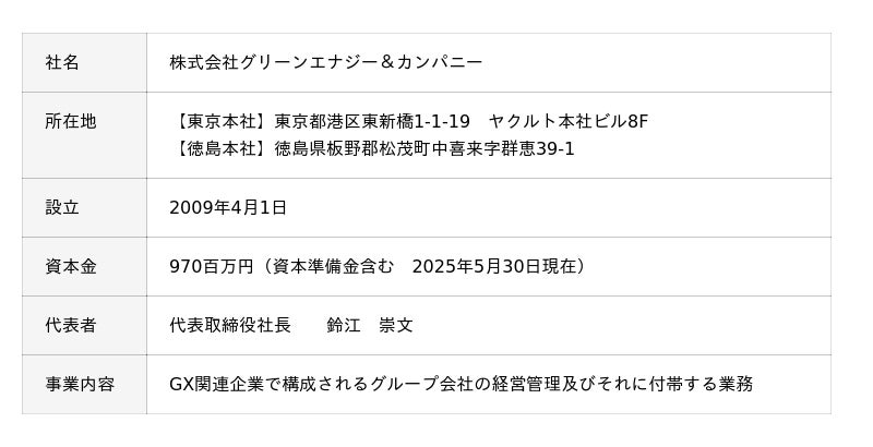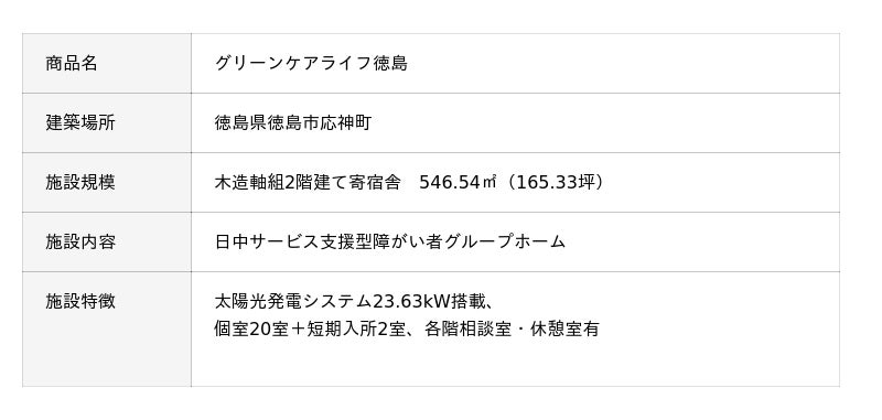 株式会社グリーンエナジー&カンパニー(東京本社:東京都港区、徳島本社:徳島県板野郡松茂町/代表取締役:鈴江 崇文、以下「当社」)の、100%子会社である株式会社グリーンエナジー・ライフ(本社:徳島県徳島市/代表取締役:竹村敏之)は、新たに注力するヘルスケア事業の第一弾として、株式会社エスエムエスクラス(本社:徳島県徳島市、代表取締役:吉村昭世、以下「SMS GROUP」)との間で、徳島県徳島市における日中サービス支援型障がい者グループホーム施設の売買契約を締結しましたので、下記の通りお知らせいたします。