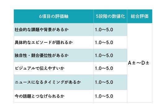 社会的課題性、独自性、ストーリー性、時事性など、6つの評価軸を基準に5段階で数値化。総合評価をA~D(+/−あり)で判定します。チーム内で共有しやすい評価レポートを提供します。
