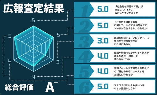 本サービスは、元新聞・テレビ記者の視点と生成AIを組み合わせ、企業のサービスや取り組みが「メディアにどれだけ取材されやすいか」を6つの評価軸で数値化するものです。広報戦略の強みや課題を明確にし、次の一手につながる客観的な評価と具体的なアドバイスを提供します。