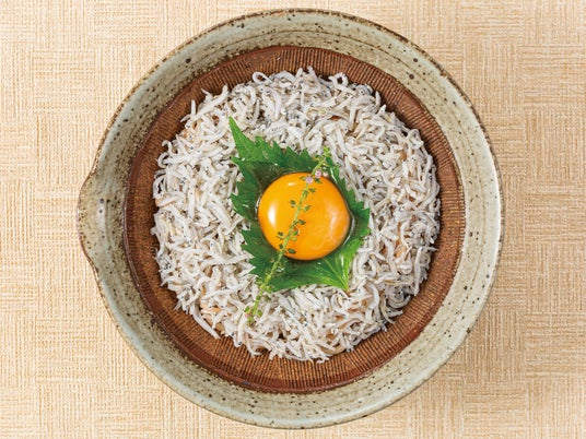 ふわふわの釜揚げしらすに、ごま油を垂らした卵黄と大葉が、シンプルなたらこリングイネを引き立てます。