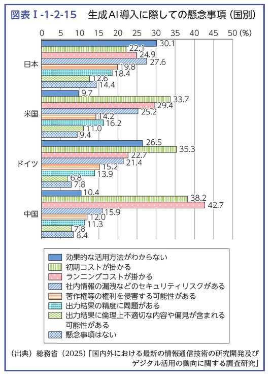 実際に、総務省「情報通信白書 令和7年版」では、生成AI導入にあたっての企業の懸念事項として、「効果的な活用方法がわからない」が最多となっており、次いで「セキュリティリスク」「コスト」などが挙げられています。