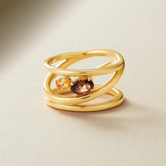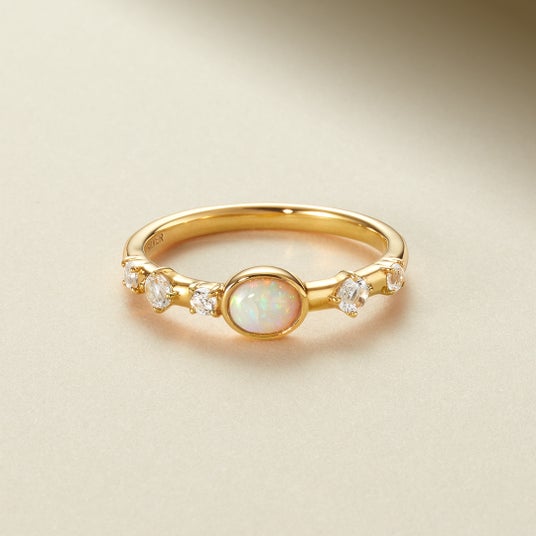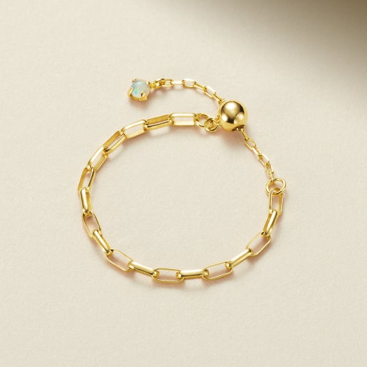 スモーキークォーツとシトリンのコントラストが美しいリングは、秋風に舞う落ち葉を思わせる、アシンメトリーな配置が魅力。360度どこから見ても美しく、指を包み込むような立体的なラインが、軽やかでありながら存在感のある手元を演出してくれます。リングは月のように優しく輝くホワイトオパールをセンターに迎えたストレートデザイン。トパーズをリズミカルにあしらい、自由に舞う葉を思わせる軽快な印象。華奢なネックレスやピアスと合わせれば、抜け感のある秋らしいスタイリングに。シンプルにも、重ね付けにも応えてくれる、スタイル自在のジュエリーです。