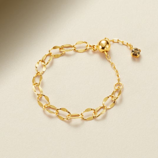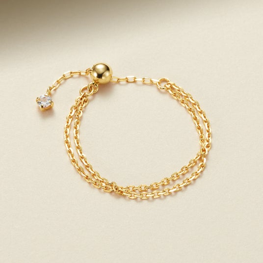 大きなコマが連なる抜け感や軽やかな光を面で反射するデザイン、繊細に編み込まれたような2連チェーンなどそれぞれ異なる表情を持つ3つのリングが、さりげない華やかさを添えてくれます。エンドには、そよ風に舞う葉のような小さなカラーストーン。リズムよく揺れるその輝きが、動きに合わせて秋色の情景を映し出します。地金にはイエローゴールドを使用。温かみのある色合いと、肌になじむ優しいトーンが、装いに自然な深みを加えます。1本でも、重ねても。装いに合わせて、自由なバランスで楽しめるリングシリーズです。