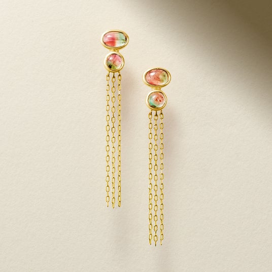ピンクからグリーンへ、ひとつの石の中に広がる豊かな色彩。まるで夕暮れに染まる空のように表情を変えるトルマリンを、それぞれのジュエリーに合わせて、厳選。ネックレスは、シンプルなフォルムの中にトルマリンの個性が際立つ一本。繊細に編み込まれたチェーンと、丸みを帯びた石座が肌に柔らかくなじみ、日常にそっと華やかさを添えてくれます。チェーンリングは、左右の石に絶妙なバイカラーを選び抜いたアシンメトリーデザイン。手元の動きに合わせてゆらりと揺れ、視線を集めるポイントに。ピアスは、チェーンのリズムとトルマリンの色が共鳴する、印象的な仕上がりです。光の角度や肌との調和で、表情を変えるトルマリン。その一瞬一瞬の輝きが、あなたの秋を彩ります。