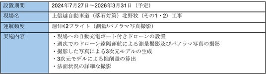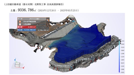 株式会社Liberaware(本社:千葉県千葉市、代表取締役:閔 弘圭、以下リベラウェア)とKDDIスマートドローン株式会社(本社:東京都千代田区、代表取締役社長:博野 雅文、以下 KDDIスマートドローン)と株式会社大林組(本社:東京都港区、代表取締役社長:佐藤 俊美、以下、大林組)の3社は、大林組が施工する上信越自動車道(落石対策)北野牧工事(以下「本工事」)において、国内で初めて(注1)建設現場に自動充電ポート付きドローンを1年間常設し、現場補助者なしの目視外飛行(レベル3)(注2)による週次の遠隔自動測量を継続運用しました。この取り組みにより、掘削量(体積)や現場の地形など進捗状況を高精度に可視化することを実現しました。