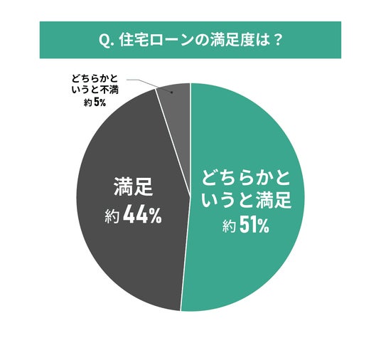 住宅ローンに対する満足度は全体的に高く、「満足」が約44%、「どちらかというと満足」が約51%で、満足層が約95%に達しています。不満を持つ人は「どちらかというと不満」が約5%のみで、「不満」は0名でした。この高い満足度は、慎重な選択プロセスの結果と考えられます。