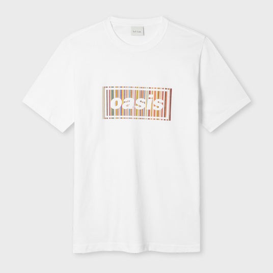 今回のコレクションには、グラフィックTシャツ、ボーダーTシャツ、キャップ、バッグ、アウターなど幅広いアイテムがラインアップ。名曲の歌詞やタイトルを落とし込んだプリントや刺繍のほか、オアシスのロゴとポール・スミスのシグネチャーストライプを組み合わせた特別仕様のデザインも登場します。