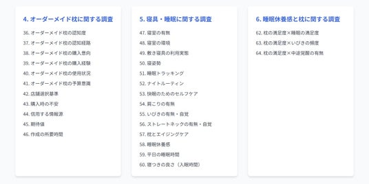 枕市場の健全な発展に寄与することを目的とした全147ページの本レポートは、「利用実態」「満足度」「購入動機」「衛生意識」「オーダーメイド枕への関心」など、全61項目 にわたる独自の調査データを掲載。製品開発やマーケティング担当者が明日から使える、示唆に富んだ考察を加えています。