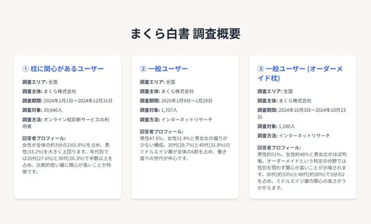 枕をはじめとする寝具・睡眠グッズの企画開発、及びインターネット販売を行っている、まくら株式会社(千葉県柏市、代表:河元智行)は、寝具・健康関連企業の製品開発やマーケティング戦略に資する最新の市場データと消費者インサイトを網羅した調査レポート「まくら白書2025」を、2025年8月29日(金)に公開しました。