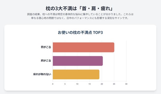 本調査で、現在の枕に62.3%が「不満」と回答 、その不満の内訳は「首こり」「肩こり」「疲れが取れない」 といった、日中のパフォーマンスに直結する身体的な悩みが上位を占めました。さらに、4人に1人(26.8%)が自らを「枕難民」と認識している、という事実は、既存製品では満たされていないニーズがいかに多いかを示しています。