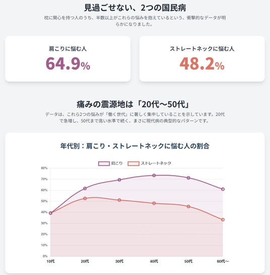 特筆すべきは、肩こりに悩む人(全体の64.9%) やストレートネックに悩む人が、20代から50代の「働く世代」に集中している点です 。従業員の睡眠の質は、日中の集中力や創造性、ひいては企業全体の生産性に直結する重要な経営資源です。