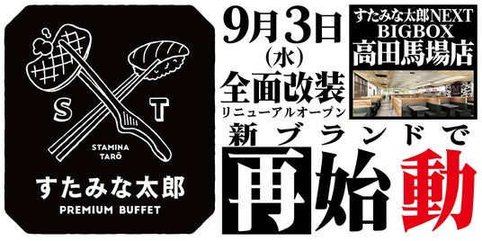 焼肉、寿司食べ放題の「すたみな太郎NEXT BIGBOX高田馬場店」が9/3(水)全面改装オープン!「すたみな太郎PREMIUM BUFFET BIG BOX高田馬場店」として再始動!限定メニューも!