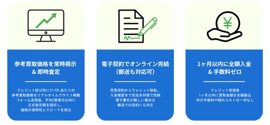 累計2億円分を既に買取済み。カーボンクレジット市場に透明性と流動性を提供し、少量案件でもオンライン完結でスピーディーに買取します!