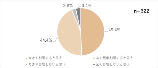 住まいの性能(断熱性、気密性)が熱帯夜の睡眠の質に影響を与えると思われる方の割合は、大きく影響すると思う:49.4%、ある程度影響すると思う:44.4%となり、約94%が、住宅性能が熱帯夜の睡眠の質に影響を与えると考えていることがわかりました。