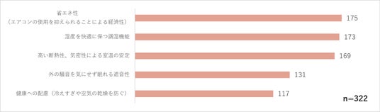 「快適な睡眠を実現できる住まい」という提案で魅力に感じる点は、「省エネ性」「調湿機能」「高い断熱性、気密性」が上位3項目となり、次いで「遮音性」、「健康への配慮」となる結果になりました。
