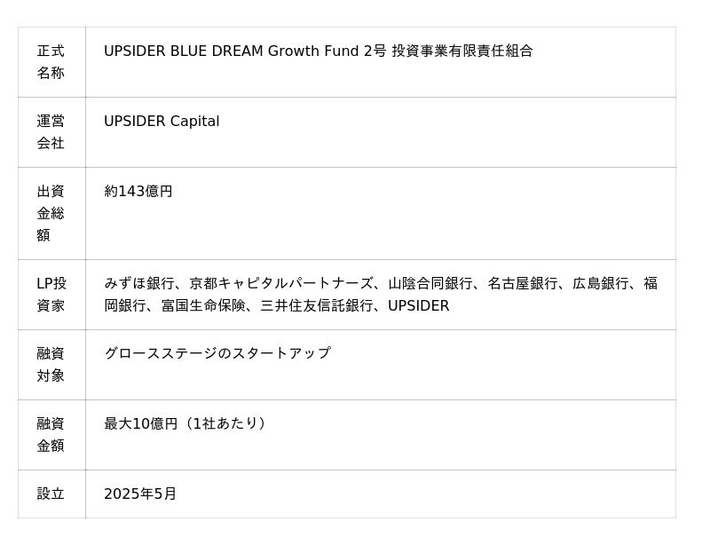 - 2025年5月、第2号ファンド「UPSIDER BLUE DREAM Growth Fund 2号」(総額143億円)を組成